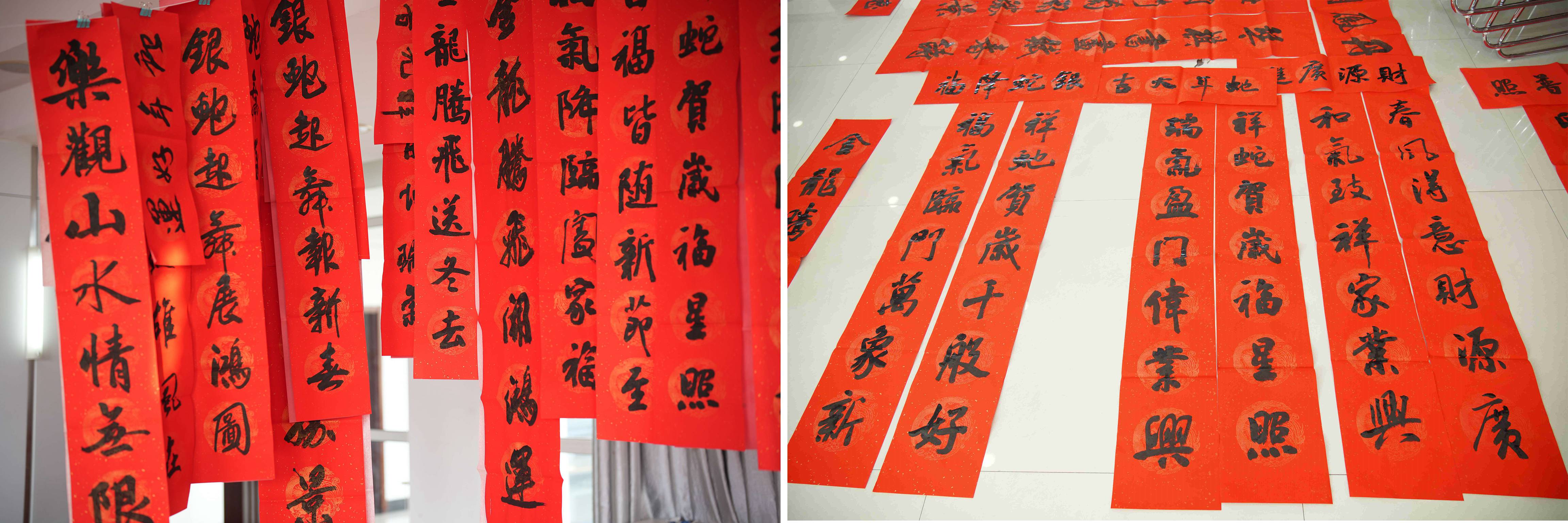 隨后,各位書法老師現場揮毫潑墨,書寫新春祝福。一張張紅彤彤的春聯象征著喜慶吉祥,傳遞著“喜迎新春,諸事和順”的美好愿望。