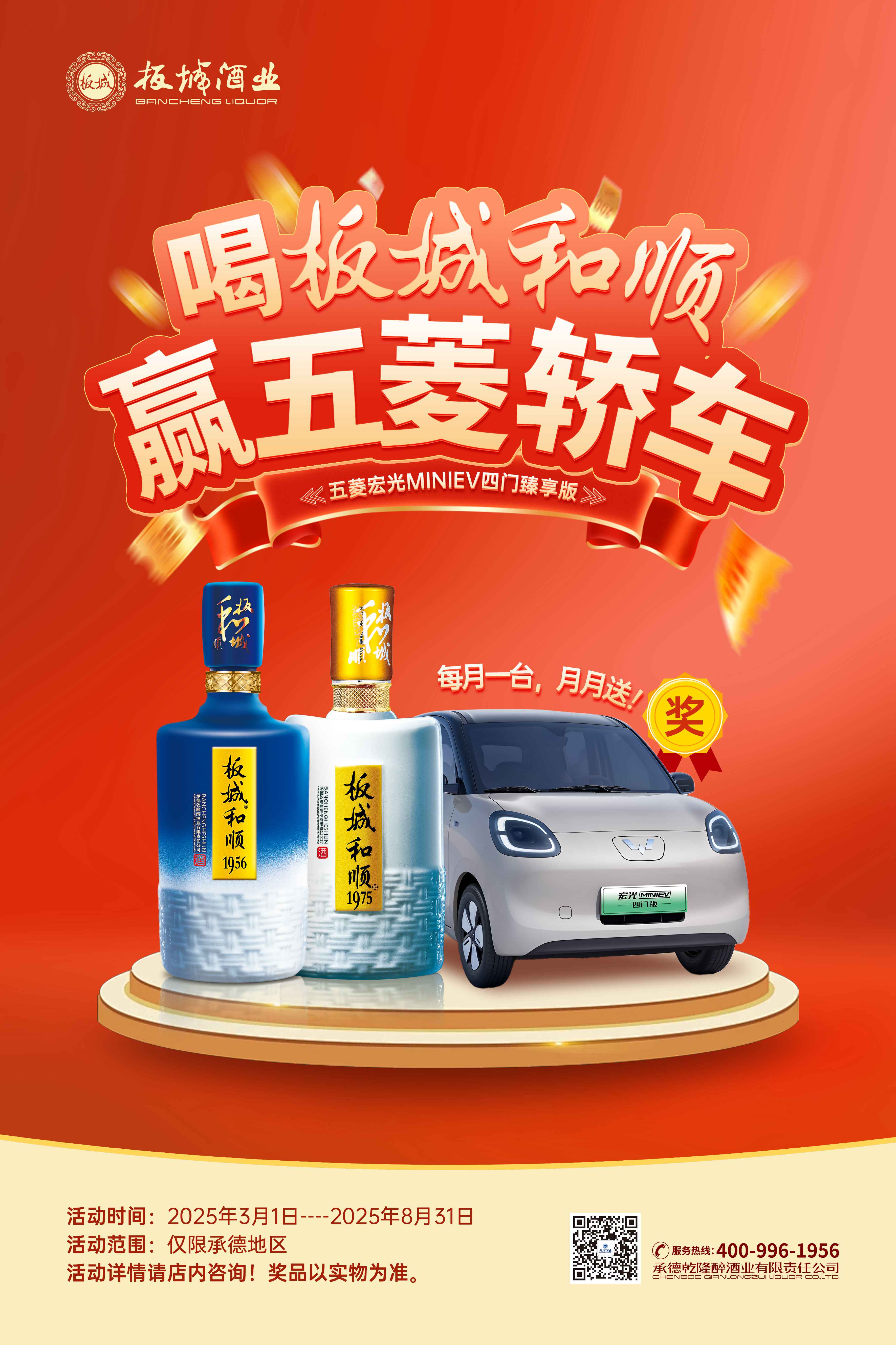 消費者在承德區域購買板城和順1975、板城和順1956(不含喜慶版)產品后,掃描瓶蓋內二維碼,即可自動參與抽獎。掃碼用戶除享受原有掃碼獎勵外,還可額外獲得贏取五菱宏光MINIEV四門臻享版汽車、雅迪電動車等重磅獎品的機會。